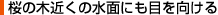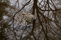 公園の桜は、池などのまわりに植えられていることが多いものです。そんな場所にでかけたら、忘れずに水面をのぞいて見ましょう。枝のような華やかさはないものの、散り落ちた桜に、せつなさを感じます。