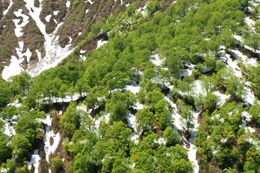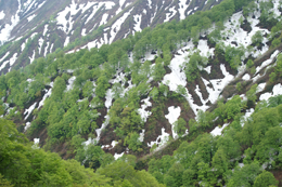 新緑の色は、天候によってもガラリと印象を変えます。晴天では、新緑本来のやわらかい黄緑となりますが、くもりや雨の日には、やや青みがかった緑となり、山全体に深みがでてきます。