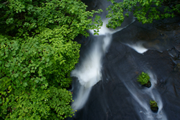 雨の風景を撮るときは、基本的に構図から空をはずしてみてください。雨の日の空は、写真にすると白くなり、しっとりとした風景の中で、ぽっかり浮いてしまいます。空を入れないことが、雨の中でもあでやかな新緑を表現するコツです。 |
