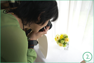 アレンジメントのバランスを整えたら、ワッフル地のバスタオルを下に敷いてセッティングを。お決まりの場所は、リビングの窓際。逆光のときは、紙で作ったレフ板を立てて光を当てます。