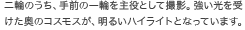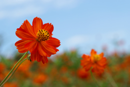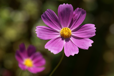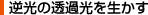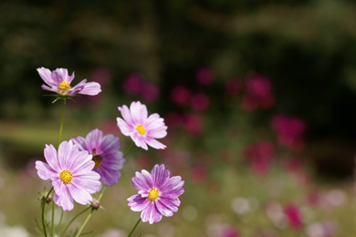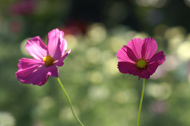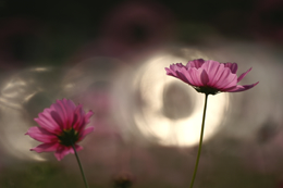 花びらが薄く、枚数も少ないコスモスは、逆光の透過光を生かすと、花びらがきれいに透けて、表情が豊かになります。逆光により花が暗くなってしまう場合は、位置を変えてやや斜光線にするか、露出をプラスに補正して、何枚か撮りくらべてみましょう。濃い色よりも、淡いピンクの花で試すときれいに透けた絵が得られます。