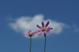 一輪を撮ったら、今度は並んで咲く二〜三輪の花を主役にしてみましょう。これも、絵としての落ち着きが良いものです。二〜三輪を撮影する場合に大切なのは、どれか一輪を主役に決めてその花にピントを合わせることです。花の高さや色合いなど、構図のバランスに工夫が必要です。一輪の花を撮るときと同じように、背景にも気を配りましょう。