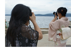 | AMIY : 絵里香さんはαで何を撮りたいですか? 若女将 : 能登の景色と・・・、やっぱり息子ですね。 AMIY : この液晶モニター使いやすいでしょ。お子さんとか撮るには最適なんです。こんな風に引き出して・・・。子どもの目線まで下げて撮ると思いも寄らないいいショットが撮れたりするんです。昔は自分が床に寝そべって撮るしかなかったショットもこうやって簡単に撮れますよ。 若女将 : すごい〜。早速、息子を撮りたいです。 AMIY : 私も息子さんの写真見せていただくのが楽しみです。子どもを一番上手に撮れるのはママなんですから。子どもはママに絶対の信頼を寄せているので、自然で無防備な顔が撮れるんですよ。あとはシャッターチャンスを見極めることに慣れること。 若女将 : どうしたら見極められるんでしょうか? AMIY : まずは子どもを観察すること。子どもはどんなに動いていても必ずピタッっと止まる瞬間があるんです。その瞬間は大抵可愛い写真になります。また慣れたら動いている時の撮影に挑戦してみてください。そのときはモードダイヤルを「スポーツ」にして撮ると、動きに対応してぶれる事が少なくなり、かなりいい感じに撮れると思います。そのときは脇を締め、カメラはしっかりホールドして子どもの動きを追う事が上手く撮れるコツですね。また子どもの表情はころころ変わるものです。とにかく沢山撮って、後で気に入ったものだけ残せばいいんです。とりあえず顔のアップは「数打てばあたる方式」が良いですよ(笑)。 若女将 : 頑張ってみます。普段仕事で保育園に預けている時間が長いので、一緒にいるときにはたくさん写真を撮りたいです。 AMIY : 楽しみですね。息子さんもママとのフォトコミュニケーションは楽しいと思いますよ。話は変わりますが、旅館の中には美術品が多いですね。まるで日本文化美術館みたい。 若女将 : そうなんです。石川県には多くの作家先生がいらっしゃるので、館内には重要無形文化財技術保有者の先生の作品も多いんですよ。