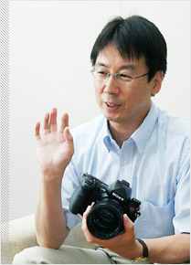 課題は、この大きなCMOSを“α ”の特長であるボディ内蔵手ブレ補正機能と両立させることでした。“α ”はイメージセンサーを動かすことで手ブレを補正しますが、今回は非常に重いセンサーを自由自在に動かさないといけません。エンジニアの苦労は大きなものでしたが、結果としては非常に満足のいくものになったと思います。これまでの“α ”と同じく、どのレンズでも手ブレ補正が効きます。手持ちで気軽に撮っていただいても、ブレのない、高精細で美しい画像が得られる。つまり、フルサイズでありながら、たいへんに扱いやすく、気軽にきれいに撮れるというカメラなのです。 |