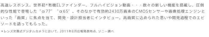 今回の“α77” “α65”は、APS-Cでいながら、フルサイズの“α900”と同等の有効約2430万画素まで高解像度化したことが最大の特長です。“α55”と比べると、同じ大きさのイメージャーで従来の約1.5倍の画素数を実現するわけですから、やはり技術的な課題を多く伴う開発になりました。それでもここまでの高画素解像度を目指した大きな理由のひとつは、やはりレンズの能力を生かしたいということがあります。αには、他にはない素晴らしいレンズ、個性的なレンズが数多くあります。レンズの描写力を余すところなくセンサーで受け止めて、性能をギリギリまで引き出してあげたいという願いは、この高画質カメラの開発の出発点でした。