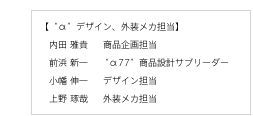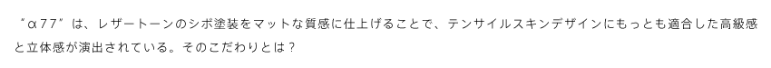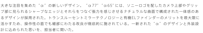 デザイナーとしては、新しい世代のデザインを作り上げるという大きなテーマをやりきったのが大きいですね。中級機を使われているユーザーの皆さまに十分満足していただけるものが作れたと自負しています。また今回は“α77”同梱のレンズであるDT 16-50mm F2.8 SSMのデザインも手がけましたが、ボディーのテンサイルスキンデザインに対してこのレンズは幾何学的な造形を強く押し出した新デザインです。このデザイン的なコントラストの妙も、味わっていただければと思っています。
