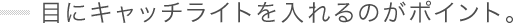 ペットは目がポイントなので、私は生徒たちに「キャッチライトは絶対入れてね」と言いますね。目に光が入らない場合は、「厚紙でもいいから添えて」とか、「白い服を着ると反射してキャッチライトが入るんだよ」と教えています。さらにかわいらしくするために、厚紙を星形に切っておくと、キャッチライトが星のカタチになってキレイなんですよ。カメラ目線を狙うときは、先ほどの奇声を出したりとか、ワンちゃん猫ちゃんの動きを制限してあげるといいですね。あとはアングルですかね。初心者の方とか上から撮影しがちですけど、ちょっとしゃがんで撮ったりすると、見えかたがずいぶん変わってきますね。