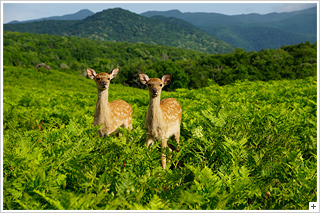 三好氏を興味津々に見つめる、2匹の子鹿。「ファインダーでバックのぼけ具合を変えて何枚か撮影した一枚です。鹿がいた時間は、10秒か20秒ぐらいなのですが、その短い時間でも指先の感覚だけで絞りをコントロールできましたね」。今回の“α77”では、背面ボタンの配置も工夫されている。「ボタンのレイアウトがとても考えられていて、すぐに覚えましたね。前後のダイヤルで直感的に操作できて、ボタンごとも感触が違うので、指の感覚を頼りに操作できます。それに、ファインダーに必要な情報が表示されるので、ファインダーから目を離さなくても一連の操作ができるし、いままでのようにファインダーで見てから液晶モニターで確認する必要がない。眼鏡を外さなくてもいいのも楽ですね」。