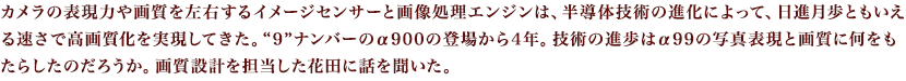 ──2008年にα900が登場してから今年で4年です。時間の経過とともにイメージセンサーなどカメラを構成するさまざまなテクノロジーが進歩しました。