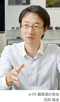 花田:この4年の間には、ソニーのNEX(Eマウント)に代表される小型一眼の登場やフルハイビジョン動画撮影の広がりなど、デジタル一眼カメラをとりまく環境にも大きな変化がありましたが、カメラそのものにおける高画質化技術という点においても大きな進化がありました。そして、この技術的な進化をα99においては、解像度と低ノイズの両立を踏まえた高い質感の実現に向けて画質設計を進めてきました。