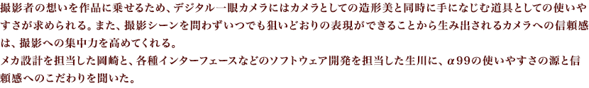 ──風景やスポーツなど、さまざまな撮影シーンで常に素早く確実な操作が求められます。α99の素早く確実な操作の源はどこにあるのでしょう。