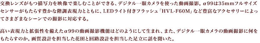 花田:フォーカス速度に代表されるように、技術だけでなく表現の方法やノウハウも静止画と動画ではちがいますね。長年にわたり映像に携わってきたソニーには“α”だけでなく“ハンディカム”や業務用カムコーダーで培ったさまざまな技術やアイデアがあります。動画撮影におけるAF感度を3段階から選択できるという機能も、本格的な動画撮影においては欠かせません。α99は最高峰の静止画クオリティを実現する一方で、35mm大判センサーの映像表現の可能性を動画性能というベクトルにも引き出したカメラになっています。その画質と性能は、α99での撮影を動画主体に想定されている方の期待にも、十分応えられる仕上がりになっています。