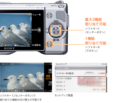 ※ソフトキーC(センターボタン)の、カスタム有効時の初期割り当て機能は、「ホワイトバランス」「ISO感度」「Dレンジオプティマイザー/オートHDR」となります