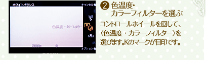 見た目に近い色合いを再現するための機能「ホワイトバランス」。あえて違う設定にすることで、見た目とは違う印象の写真にしてみましょう。