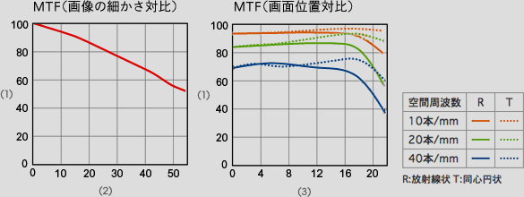 (1) コントラストの再現(%) (2) 像の細かさ (空間周波数 本/mm) (3) 画面中心からの距離 (mm)