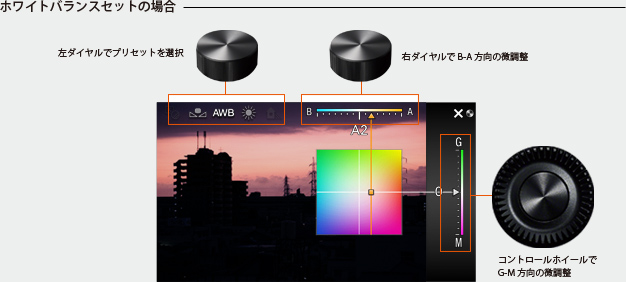 光の強さが刻々と変わる夕暮れの空。最も美しい色に染まる瞬間は、ほんの数秒。こんなときこそトライダイヤルナビを存分に活用したい。従来のカメラではメニュー画面を呼び出し、深い階層をたどって「ホワイトバランス」や「クリエイティブスタイル」を設定する必要がある。しかし、NEX-7なら「ホワイトバランスセット」や「クリエイティブスタイルセット」をファンクションセットの1に割り当てておけば、色温度やカラーフィルター、画像の仕上がりをすばやく変更できる。刻々と変わる光の状態に合わせて設定を変えられるので、自分のイメージ通りの色あいにその場で調整可能だ。