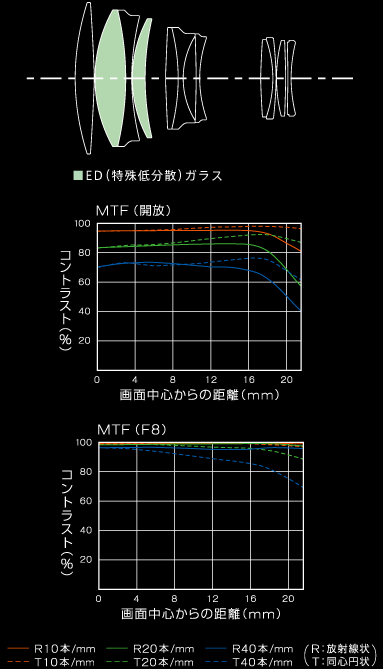 シャープな描写という点について言えば、フローティングフォーカスを使用していることがひとつのポイントです。フローティングの仕組みは2つのレンズが動き、焦点距離の変化でピント面が動いても、中心と周辺のバランスなどが変わってしまうのを抑えることができます。これにより、ただ単にシャープというだけでなく、距離が変化したときでもシャープさを保ち続けるような設計をしているのが特徴です。さらにEDガラスを入れることで色のにじみを抑えているのも、忘れてはならないポイントです。(大竹)