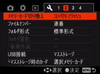 MENU(メニュー)ボタンを押し、セットアップメニューの [タブ2] 内にある「メモリーカード」の設定が、アップグレード用に用意した記録メディアと一致していることを確認します。
