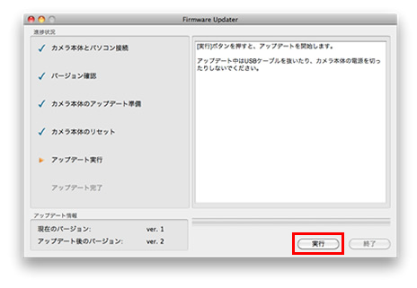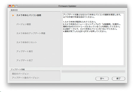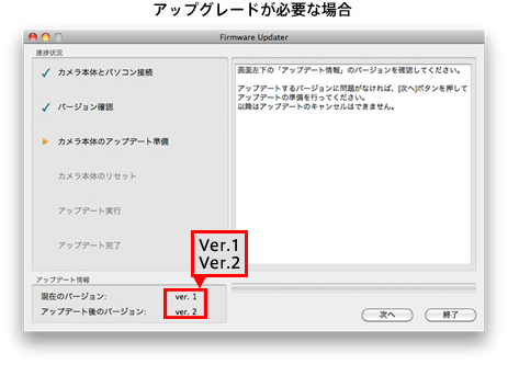 - 1.パソコンとカメラ本体の表示を確認後、「次へ」をクリックすると現在のバージョンとアップグレード後のバージョンが表示されます。