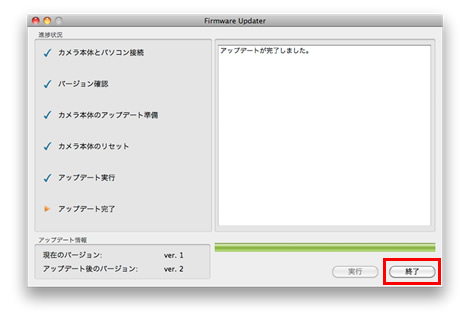 - アップグレードが完了すると、下のような表示に変わります。[終了]をクリックしUSB接続を外します。
