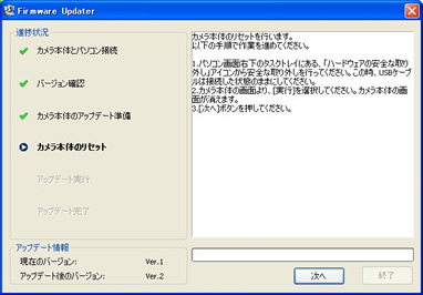 - 1.パソコンとカメラ本体の表示を確認後、「次へ」をクリックすると現在のバージョンとアップグレード後のバージョンが表示されます。