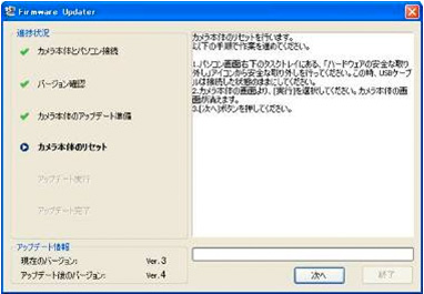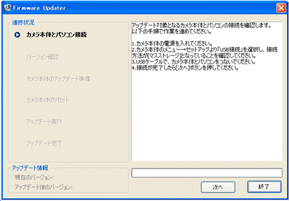 - 1.パソコンとカメラ本体の表示を確認後、「次へ」をクリックすると現在のバージョンとアップグレード後のバージョンが表示されます。