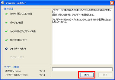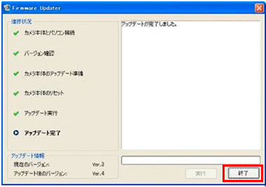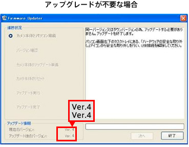- 「現在のバージョン」が「Ver.4」になっている場合はアップグレードする必要がありません。メッセージに従ってUSB接続を解除して「終了」をクリックします。
