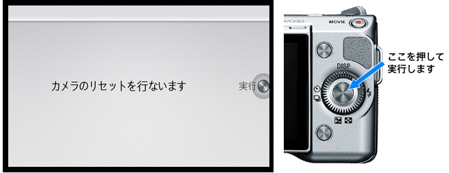 カメラ本体の電源を切って、バッテリーパックもしくはACアダプターを一度取り外してから電源を入れなおしてください。
