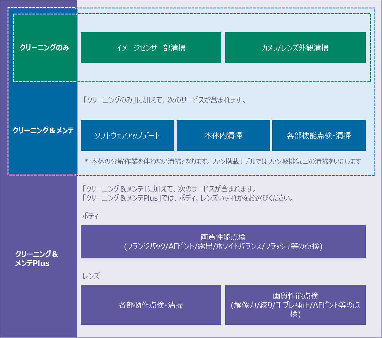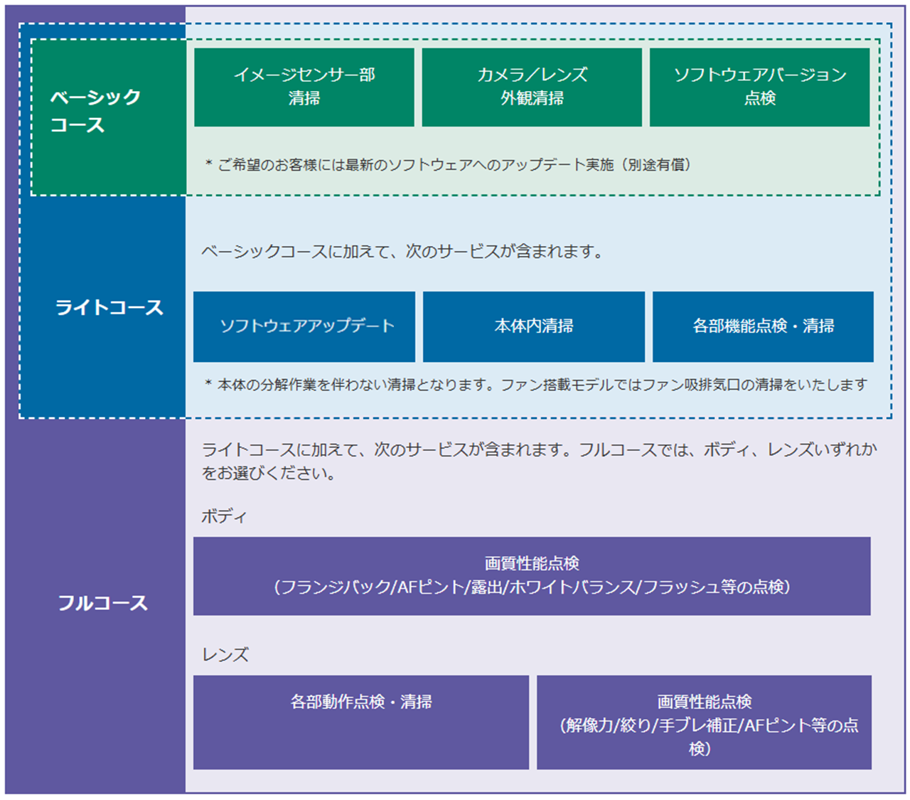 | サービス料金 | 11,000円(税込) ボディ1台+レンズ1本 ソフトウェアアップデート含む |