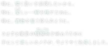 時に、描く思いを表現したいから。時に、愛しい一瞬を残すために。時に、獲物を狙う狩人のように。さまざま撮影の醍醐味を味わうために手にして欲しいカメラが、今ようやく完成しました。