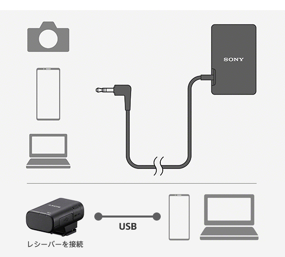 マイクロホン側に外部マイク入力端子としてφ3.5mmミニジャック(モノラル)を搭載し、レシーバー側には音声出力端子としてφ3.5mmミニジャック(ステレオ)を搭載しています。さらに、USBデジタル音声出力が可能で、USB接続したスマートフォンやPCへレシーバーからデジタル音声(48kHz/24bit)を出力できます。