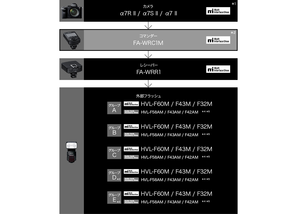 *2 対応機種:HVL-F60M、HVL-F43M、HVL-F32M(マルチインターフェースシュー対応モデル)/HVL-F58AM、HVL-F43AM、HVL-F42AM(オートロックアクセサリーシュー対応モデル)(発光モードはマニュアルのみ使用可能です)