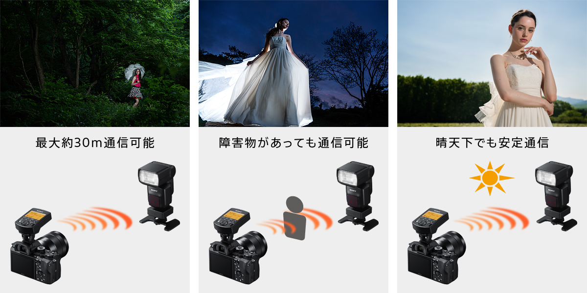 電波通信方式により、最大約30mの通信距離を実現し、より離れた場所でのワイヤレスフラッシュ撮影が可能です。また、カメラの背後にフラッシュを設置して撮影する場合や障害物が多い場所での撮影など赤外光が届きにくいシーンや、強い太陽光の下での撮影でも安定した通信ができます。