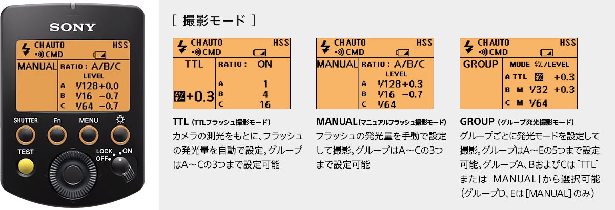 撮影モードはTTLフラッシュ撮影モード、マニュアルフラッシュ撮影モード、グループ発光撮影モードの3つのモードを搭載し、さまざまなスタイルの撮影に対応します。