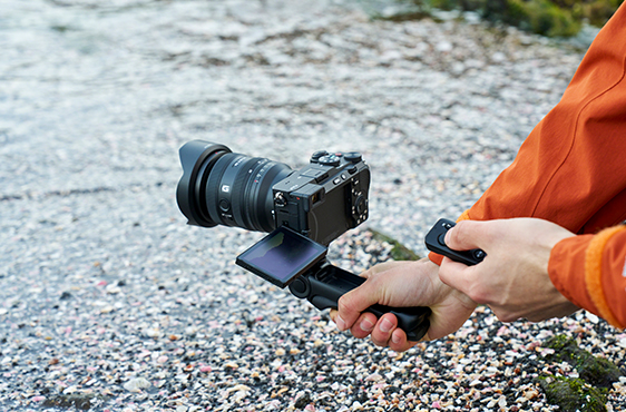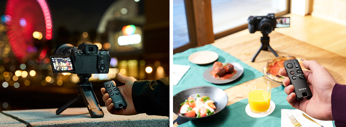 着脱可能なリモートコントローラーによって、離れた場所からシャッターが切れるため、手ブレを抑えた撮影が可能。また、主要なカメラ操作のボタンが指元に配置されているため、グリップの状態でも快適に使用できます。グリップの状態での手持ち撮影はもちろん、すばやく三脚の状態に切り換えて、安定した写真や動画、グループショット、風景写真、ソロ撮影などを行えます。
