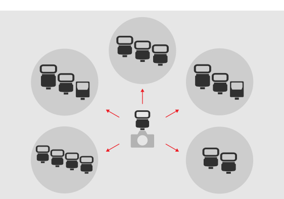 電波式ワイヤレス通信機能を搭載。1台を対応カメラ(*1)に装着し、もう1台をペアリングすることでコマンダー(電波の送信側)としても、レシーバー(電波の受信側)としても使用できます。また、コマンダー機能使用時は、最大5グループ(*2)に分けて最大15台までの対応フラッシュやレシーバーと接続したワイヤレス撮影が可能です。