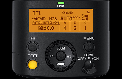 Fnボタンを押すと、選択している発光モードなど画面の表示内容に応じて、簡単に撮影の設定変更ができます。従来機種HVL-F45RMではFnボタンを押した際のみに表示されていた[WL OFF(Wireless 切)]と[MR OFF(Memory Recall 切)]アイコンが通常表示画面でも表示されるようになり、視認性がより高まりました。