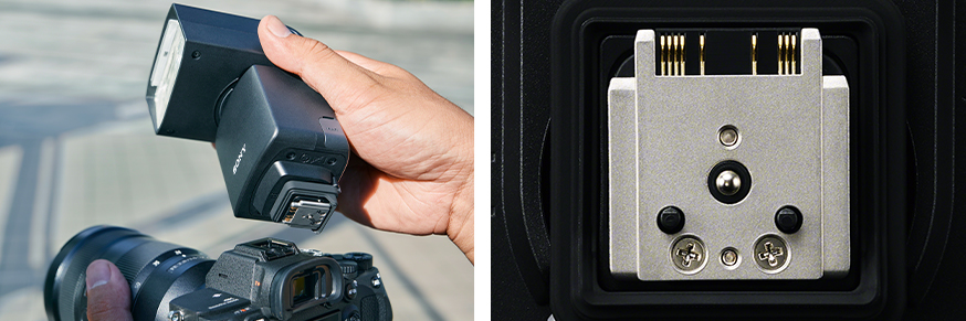 *2 対応カメラ:α1/α9 II/α7R IV(ILCE-7RM4A)、α7R IV(ILCE-7RM4)/α7S III/α7 IV(2021年12月時点)。対象のカメラに装着しロックした状態では、より一層水滴の浸入を防ぎ信頼性が向上します。HVL-F60RM用レインガード FA-RG1 は不要です