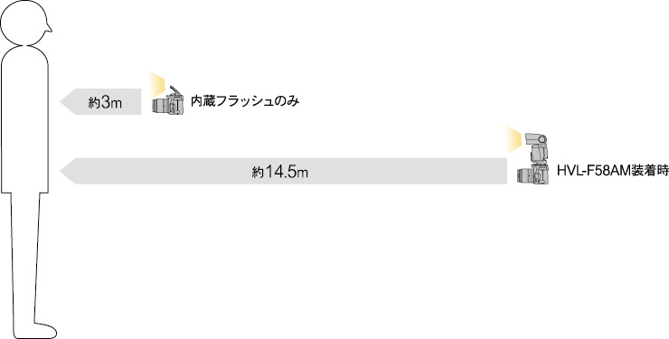 α本体に搭載されたガイドナンバー12(*)の内蔵フラッシュでは、ISO100で絞りがF4の場合、フラッシュ光の到達距離は約3m。ちょっとした記念撮影なら可能ですが、より遠くまでフラッシュ光を届かせるには光量の大きい外部フラッシュが必要です。また、外部フラッシュは大光量を生かしてフラッシュ光を壁や天井にバウンスさせることもできます。光がやわらかく拡散することで、被写体の背後に強い影が出ることを防ぎ、より自然な写真を撮影することができます。