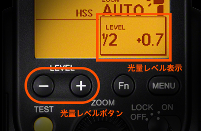 独立した光量レベル(LEVEL -/+)ボタンで、光量や調光補正値の設定をダイレクトにすばやく操作できます。また、操作画面で光量レベルが一目でわかり、直感的に操作できます。さらに、ワイヤレスでペアリングした他のフラッシュの光量設定も行え、ワークフローを短縮できます。