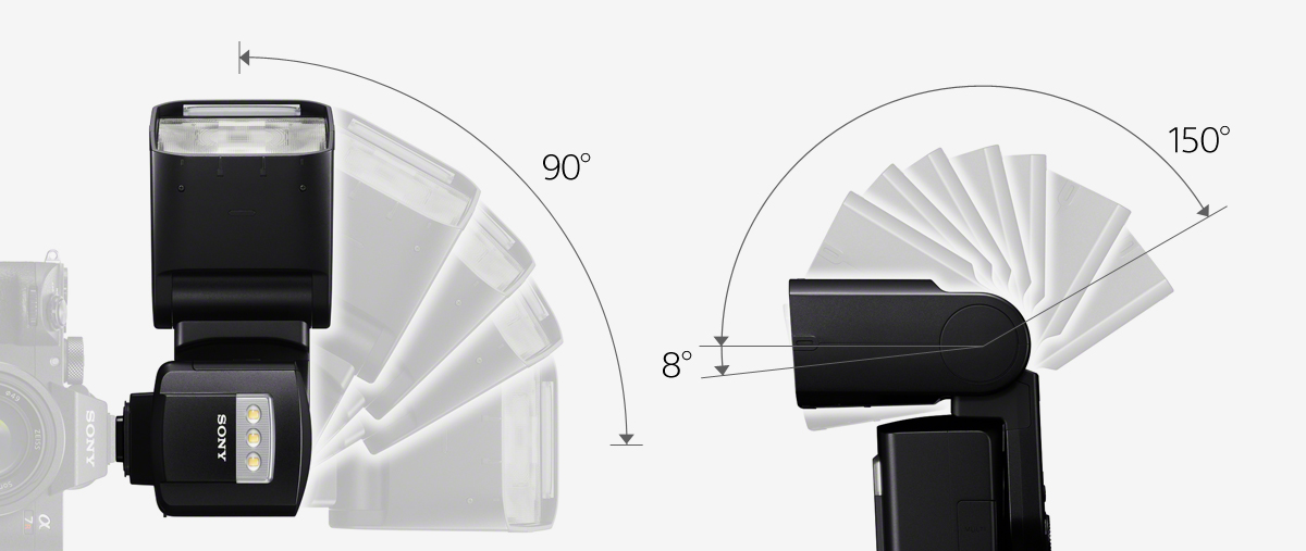 クイックシフトバウンスの採用により、左右90°、上150°、下8°に発光部分をフレキシブルに可動させることができ、迅速に縦位置・横位置の切り替えができます。また、従来のクイックシフトバウンスの構造を見直し、携行性の高いEマウントシステムに適した小型設計を実現しています。