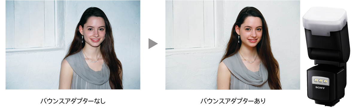 付属のバウンスアダプターを装着することにより、フラッシュ光を拡散して全体を明るくし、よりやわらかい雰囲気に撮影できます。ワイドパネルとの併用で、さらに効果が高まります。