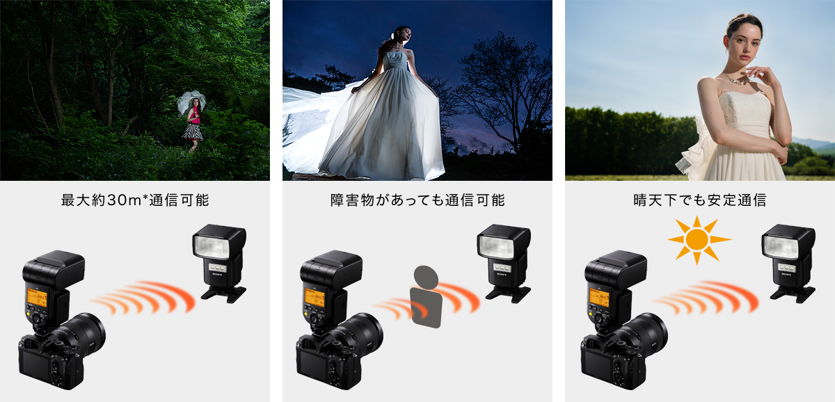 電波通信方式により、最大約30m(*)の通信距離を実現。指向性がないため、アンブレラ使用時や障害物の多い環境下でも、自由度の高いライティングが可能です。また、強い太陽光の下でも、安定した通信が行えます。