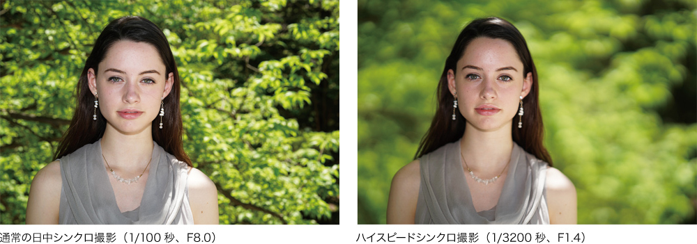 従来の日中シンクロではシャッター速度がフラッシュの同調速度以下に制限されて絞りが絞りこまれるため、背景のぼけ効果を生かせませんでした。ハイスピードシンクロ機能ではシャッターの全速度に同調(*)できるので、絞りを開けて撮影可能。大口径レンズで背景をぼかした美しいポートレートが簡単に写せます。さらに、ワイヤレスによるハイスピードシンクロ撮影も可能です。
