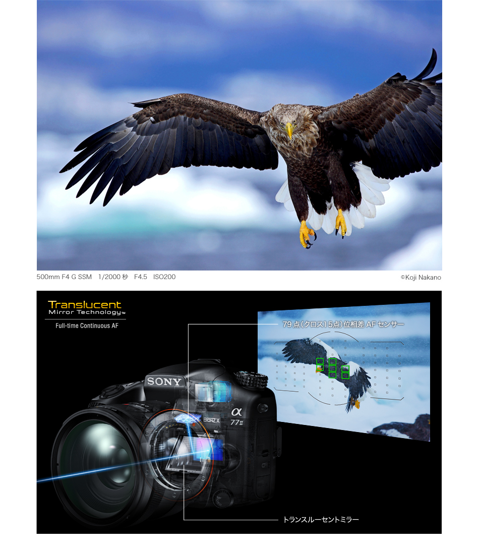 世界最多(*)79点の測距点数を誇る位相差AFセンサーを新開発。格段に向上した広範囲かつ高密度なAFカバーエリアにより、被写体を面で捉える卓越した捕捉性能を実現。さらにソニー独自の透過ミラーを採用した「トランスルーセントミラー・テクノロジー」により、常にイメージセンサーとAFセンサーに光を導き、高速・高精度な位相差AFを常時駆動。またAFアルゴリズムも改良し、79点のAF測距情報に加えて、被写体位置の連続性を加味した位置情報を組み合わせることで、被写体の次の動きを予測して狙いのポイントに正確に合焦できるようになりました。被写体を狙った瞬間のAFの食いつきと、捉えて離さない追随性を極限まで高めた、かつてないAFシステムが撮影者をサポートします。