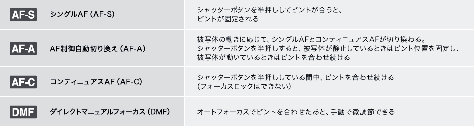 手動でピントを合わせるマニュアルフォーカスの他に、オートフォーカスモードでは動いている被写体にピントを合わせ続ける「コンティニュアスAF(AF-C)」、静止している被写体に適した「シングルAF(AF-S)」、被写体の動きを検知してカメラが自動で切り替える「AF制御自動切り替え(AF-A)」を選択可能。またAFでピントを合わせた後に、手動でピントを調節できる「ダイレクトマニュアルフォーカス(DMF)」にも対応。AFとMFを瞬時に切り替えられるので、マクロ撮影などで微妙なピント合わせを行うときに威力を発揮します。