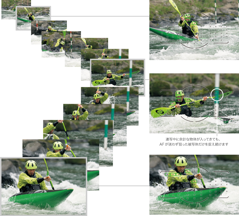 新しいAFアルゴリズムを採用したα77IIは、79点のAF測距情報に加え、被写体位置の連続性も加味した位置情報を組み合わせることで、被写体の次の動きを予測して狙いのポイントに正確に合焦。障害物にひかれにくい安定した被写体追随性と高い応答性を備えた捕捉性能で、狙った被写体を的確に捉え続けます。