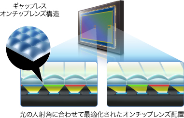 レンズから入射する光を最大限にイメージセンサーに取り込むため、隣接する画素間のギャップを最小限に抑える「ギャップレスオンチップレンズ構造」を採用し、集光効率を飛躍的に高めました。さらにオンチップレンズの位置を光の入射角に合わせて最適化し、入射角が厳しくなるイメージセンサー周縁部まで高画質を実現しています。