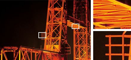 センサーの多画素化にともない、深い被写界深度で撮影する風景撮影などで課題となるのが回折現象です。画素サイズが小さくなるほど、また絞りを絞るほど顕著に現れるこの症状を低減する回折低減処理を搭載。絞り値に応じたフィルタ処理を適用し、パンフォーカス撮影においても高い解像感を実現しています。