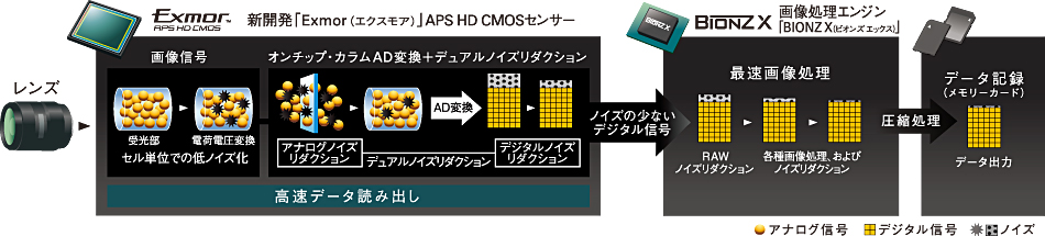 独自の「オンチップ・カラムAD変換」方式を採用し、センサーチップ内でADコンバーターが一括変換を行い、ノイズの発生を抑えつつデータを高速転送。さらに、アナログ段階とデジタル変換後の2回、ノイズ成分の除去を行う「デュアルノイズリダクション回路」の搭載により、高感度撮影時でも圧倒的な低ノイズでクリアな画質を実現しています。